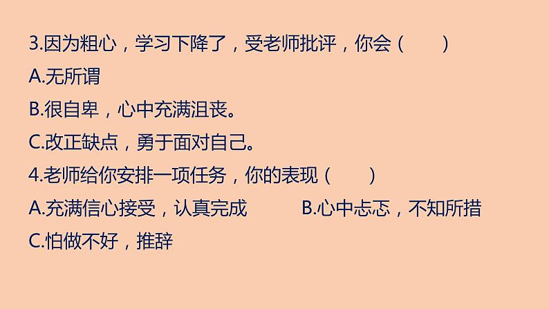 3.因为粗心,学习下降了,受老师批评,你会( )A.无所谓 B.很自卑,心中充满沮丧。C.改正缺点,勇于面对自己。4.老师给你安排一项任务,你的表现( )A.充满信心接受,认真完成 B.心中忐忑,不知所措C.怕做不好,推辞