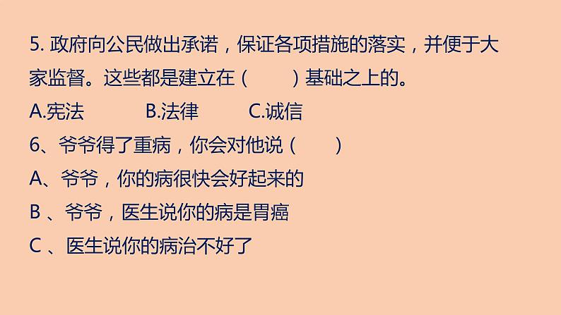 5. 政府向公民做出承诺,保证各项措施的落实,并便于大家监督。这些都是建立在( )基础之上的。A.宪法 B.法律 C.诚信6、爷爷得了重病,你会对他说( )A、爷爷,你的病很快会好起来的 B 、爷爷,医生说你的病是胃癌 C 、医生说你的病治不好了