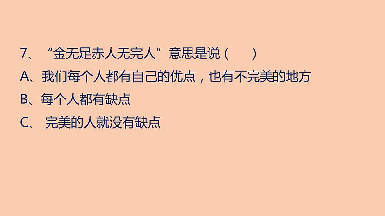 7、“金无足赤人无完人”意思是说( )A、我们每个人都有自己的优点,也有不完美的地方B、每个人都有缺点 C、 完美的人就没有缺点