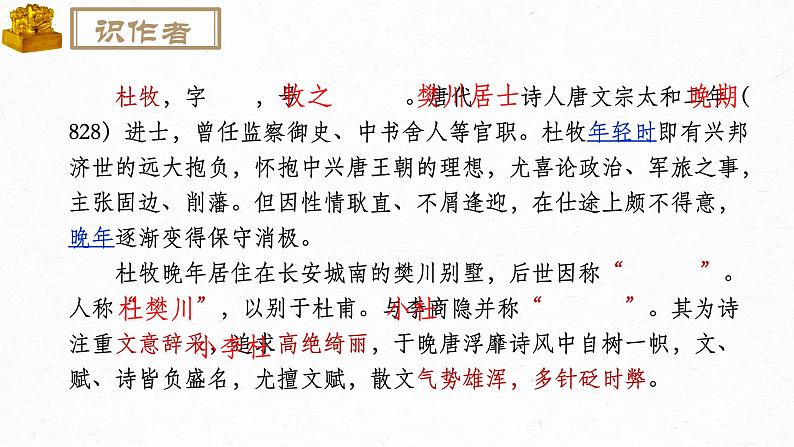 杜牧,字 ,号 。唐代 诗人唐文宗太和二年(828)进士,曾任监察御史、中书舍人等官职。杜牧年轻时即有兴邦济世的远大抱负,怀抱中兴唐王朝的理想,尤喜论政治、军旅之事,主张固边、削藩。但因性情耿直、不屑逢迎,在仕途上颇不得意,晚年逐渐变得保守消极。 杜牧晚年居住在长安城南的樊川别墅,后世因称“ ”。人称“ ”,以别于杜甫。与李商隐并称“ ”。其为诗注重文意辞采,追求高绝绮丽,于晚唐浮靡诗风中自树一帜,文、赋、诗皆负盛名,尤擅文赋,散文气势雄浑,多针砭时弊。