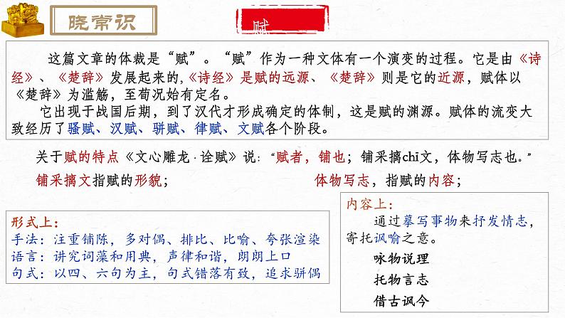 这篇文章的体裁是“赋”。“赋”作为一种文体有一个演变的过程。它是由《诗经》、《楚辞》发展起来的,《诗经》是赋的远源、《楚辞》则是它的近源,赋体以《楚辞》为滥觞,至荀况始有定名。 它出现于战国后期,到了汉代才形成确定的体制,这是赋的渊源。赋体的流变大致经历了骚赋、汉赋、骈赋、律赋、文赋各个阶段。