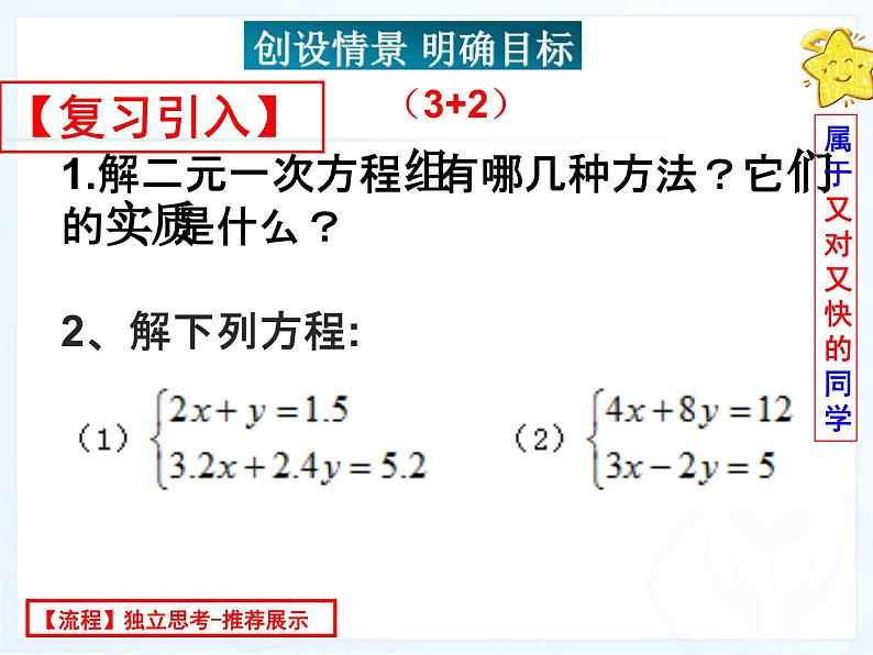 1、方程组中未知数的系数有小数怎么办?2、思考:上述两题可用哪些方法解答?各用什么方法解答比较简单?3、展示解题过程(任选一种解法)。