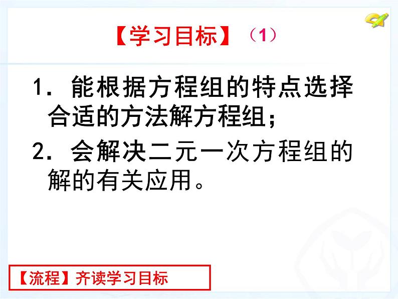 1.能根据方程组的特点选择合适的方法解方程组;2.会解决二元一次方程组的解的有关应用。