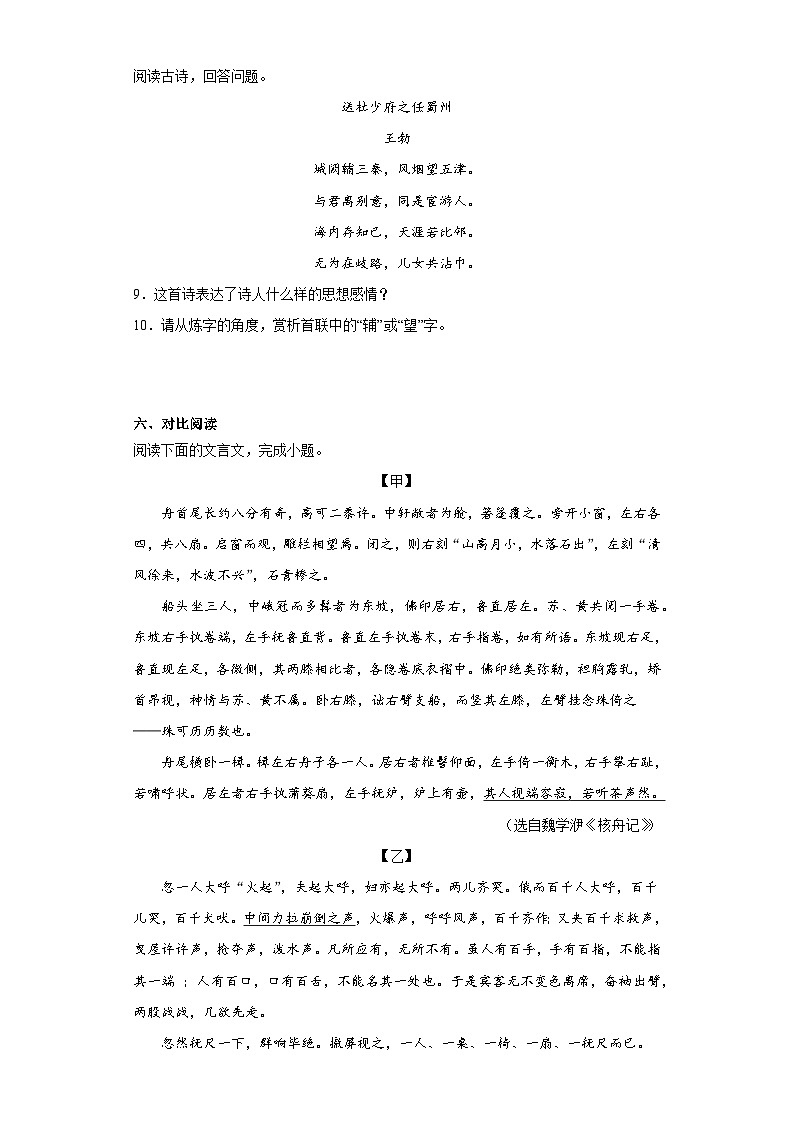 【解析】9.试题分析:抓住关键诗句来体会诗人的思想感情。从颔联“与君离别意,同是宦游人”可以体会到诗人与朋友的惜别之情;虽为离别,诗歌颈联“海内存知己,天涯若比邻”劝慰友人不必为离别而悲伤,给人以莫大的安慰和鼓舞,表现了诗人的宽阔的胸襟。透露出积极向上的人生态度。
