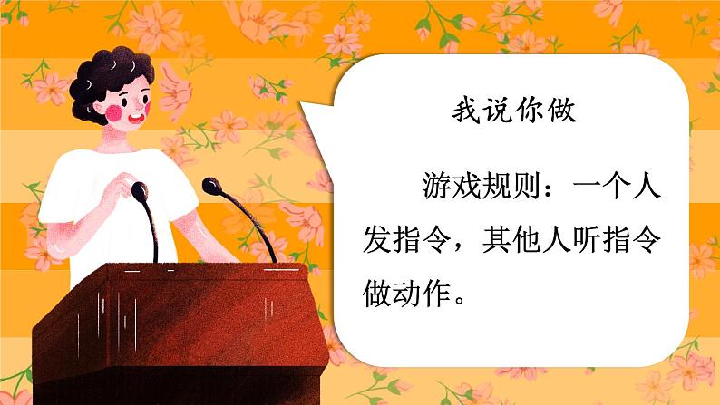 这个游戏好玩吗?今天我们一起玩一个游戏,名字叫作“我说你做”, 一个人发指令,其他人听指令做动作。(板书课题)