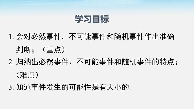 1. 会对必然事件,不可能事件和随机事件作出准确 判断;(重点)2. 归纳出必然事件、不可能事件和随机事件的特点; (难点)3. 知道事件发生的可能性是有大小的.
