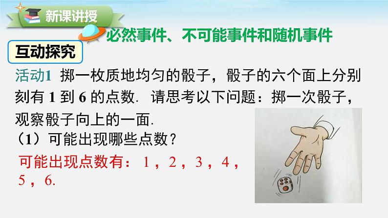 活动1 掷一枚质地均匀的骰子,骰子的六个面上分别刻有 1 到 6 的点数. 请思考以下问题:掷一次骰子,观察骰子向上的一面.