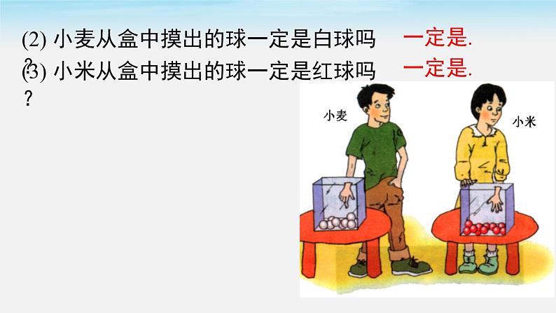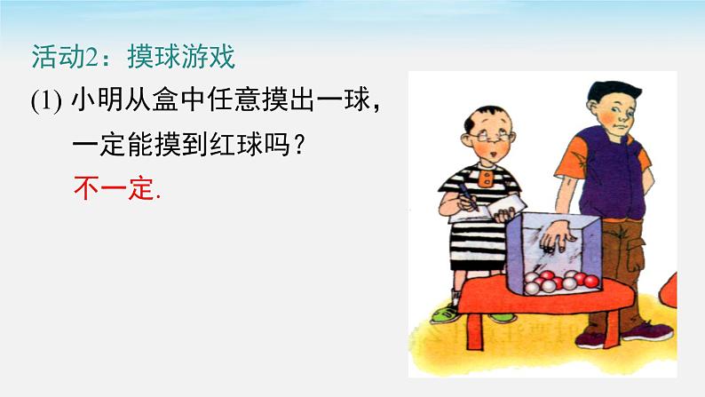 活动2:摸球游戏(1) 小明从盒中任意摸出一球, 一定能摸到红球吗?