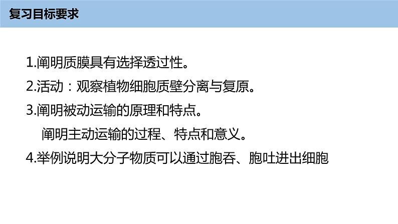 1.阐明质膜具有选择透过性。2.活动:观察植物细胞质壁分离与复原。3.阐明被动运输的原理和特点。 阐明主动运输的过程、特点和意义。4.举例说明大分子物质可以通过胞吞、胞吐进出细胞