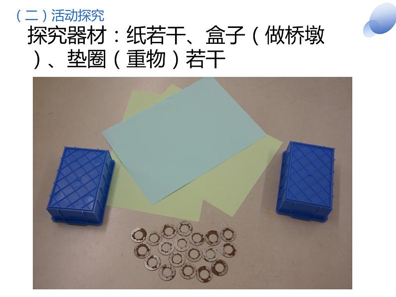 探究器材:纸若干、盒子(做桥墩)、垫圈(重物)若干