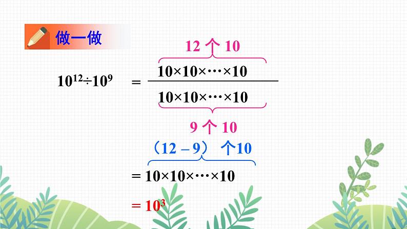 这是一份北师大版七年级下册第一章 整式的乘除3 同底数幂的除法完美版课件ppt,共24页。PPT课件主要包含了÷109,个10,m÷10n,m个10,n个10,10m–n,n个–3,m个–3,你发现了什么,由幂的定义得等内容,欢迎下载使用。