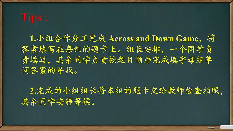Tips : 1.小组合作分工完成 Acrss and Dwn Game,将答案填写在每组的题卡上。组长安排,一个同学负责填写,其余同学负责按题目顺序完成填字母组单词答案的寻找。 2.完成的小组组长将本组的题卡交给教师检查拍照,其余同学安静等候。