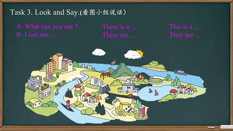 这是一份小学英语湘少版四年级下册Unit 3 What can you see?课文配套课件ppt,共17页。PPT课件主要包含了Review,Free talk,down,town,city,Pair-work等内容,欢迎下载使用。