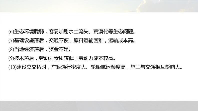 (6)生态环境脆弱,容易加剧水土流失、荒漠化等生态问题。(7)基础设施落后,交通不便,原料运输困难,运输成本高。(8)当地经济落后,资金不足。(9)技术落后,劳动力素质较低;劳动力成本较高。(10)建设立交桥时,车辆通行密度大、轮船航运频度高,施工与交通相互影响大。