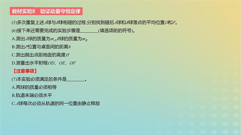 (5)多次重复上述A球与B球相碰的过程,分别找到碰后A球和B球落点的平均位置D和F。(6)接下来还需要完成的实验步骤是 (填选项前的符号)。 A.测出A球的质量为mA,B球的质量为mBB.测出P位置与桌面间的距离hC.测出抛出点距地面的高度HD.测量出水平射程OD、OE、OF【注意事项】(7)本实验必须满足的条件是 。 A.两球的质量必须相等B.轨道末端必须水平C.A球每次必须从轨道的同一位置由静止释放