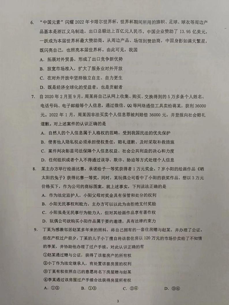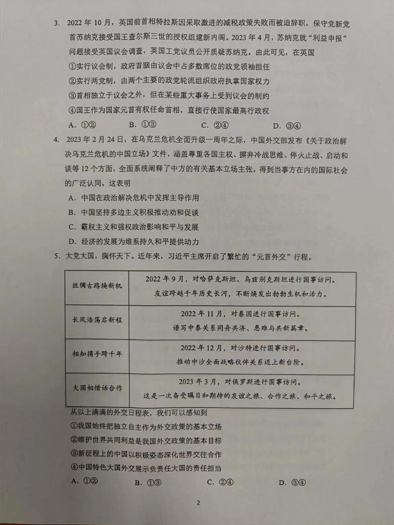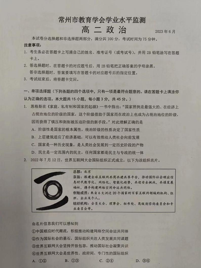 江苏省常州市教育学会2022-2023学年高二下学期期末学业水平监测政治试卷