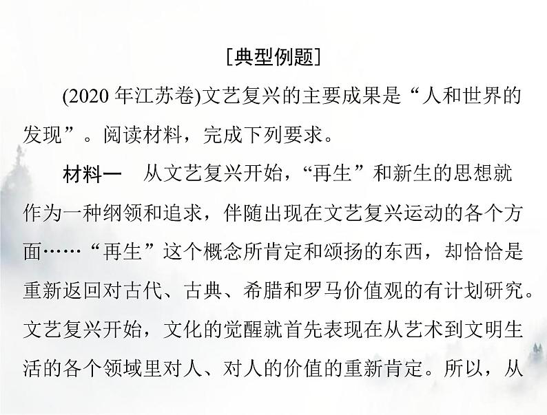 展开[典型例题](2020 年江苏卷)文艺复兴的主要成果是“人和世界的发现”。阅读材料,完成下列要求。