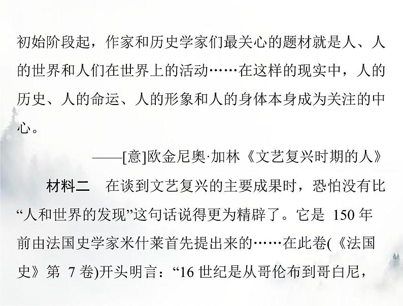 (2)根据材料一、材料二并结合所学知识,就米什莱在研究文艺复兴时提出的“人和世界的发现”写一篇小论文。(要求:观点明确,史论结合,逻辑严密,表述通畅,280 字左右)学以致用: