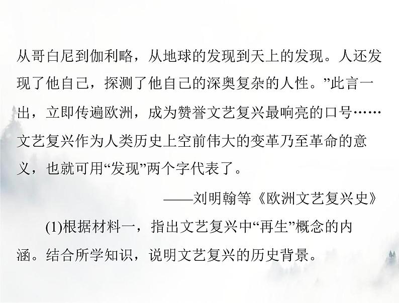 ——刘明翰等《欧洲文艺复兴史》(1)根据材料一,指出文艺复兴中“再生”概念的内涵。结合所学知识,说明文艺复兴的历史背景。