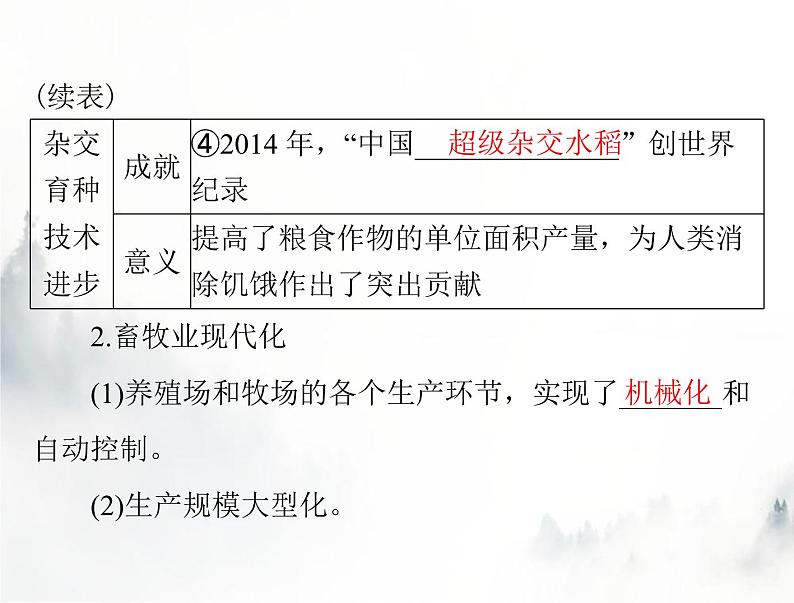 (1)农业生产手段现代化:运用先进设备代替人的手工劳动,降低了对劳动者的体力要求,提高了劳动生产率。(2)农业生产技术科学化:把先进的科学技术广泛应用于农业,提高农业生产的科技水平和农产品的科技含量。(3)农业经营方式产业化:形成种养加、产供销、贸工
