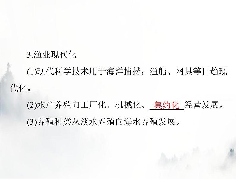 (1)现代科学技术用于海洋捕捞,渔船、网具等日趋现代化。(2)水产养殖向工厂化、机械化、________经营发展。(3)养殖种类从淡水养殖向海水养殖发展。