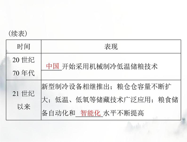 这是一份2024届高考历史一轮总复习选择性必修2第一单元第3课现代食物的生产储备与食品安全课件,共14页。PPT课件主要包含了方面的进步,食物生产的现代化,生产技术,机器生产,性进展,高科技,机械化,粮食储存技术,机械制冷,领域的技术不断进步等内容,欢迎下载使用。