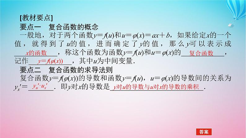 展开[教材要点]要点一 复合函数的概念一般地,对于两个函数y=f(u)和u=φ(x)=ax+b,如果给定x的一个值,就得到了u的值,进而确定了y的值,那么y可以表示成____________,称这个函数为函数y=f(u)和u=φ(x)的____________,记作____________,其中u为中间变量.要点二 复合函数的求导法则复合函数y=f(φ(x))的导数和函数y=f(u),u=φ(x)的导数间的关系为yx′=_______.即y对x的导数是__________________________.