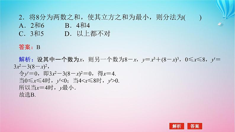 7.1 实际问题中导数的意义7.2 实际问题中的最值问题新知初探·课前预习题型探究·课堂解透新知初探·课前预习[教材要点]要点一 导数的实际意义在日常生活和科学领域中,有许多需要用导数概念来理解的量.以中学物理为例,速度是________关于________的导数,线密度是________关于________的导数,功率是________关于________的导数等.要点二 最优化问题在实际问题中,经常会遇到解决一些如面积最小、体积最大、成本最低、时间最少等问题,这些问题通称为最优化问题.导数是解决最优化问题的一个重要工具.路程时间质量长度功时间[基础自测]1.如果物体做直线运动的方程为s(t)=2(1-t)2,则其在t=4 s时的瞬时速度为( )A.12 B.-12C.4 D.-4答案:A解析:s′(t)=-4(1-t).t=4 s时,s′(4)=12.所以瞬时速度为12.故选A.2.将8分为两数之和,使其立方之和为最小,则分法为( )A.2和6 B.4和4C.3和5 D.以上都不对答案:B解析:设其中一个数为x,则另一个数为8-x,y=x3+(8-x)3,0≤x≤8,y′=3x2-3(8-x)2,令y′=0,即3x2-3(8-x)2=0,得x=4.当0≤x≤4时,y′<0;当4