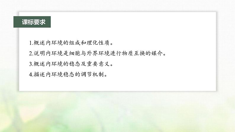 1.概述内环境的组成和理化性质。2.说明内环境是细胞与外界环境进行物质互换的媒介。3.概述内环境的稳态及重要意义。4.描述内环境稳态的调节机制。