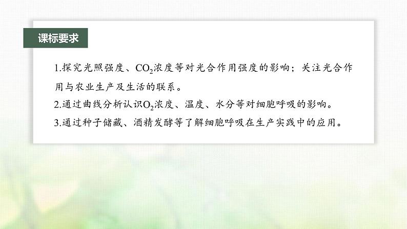 1.探究光照强度、CO2浓度等对光合作用强度的影响;关注光合作用与农业生产及生活的联系。2.通过曲线分析认识O2浓度、温度、水分等对细胞呼吸的影响。3.通过种子储藏、酒精发酵等了解细胞呼吸在生产实践中的应用。