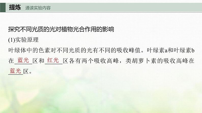 探究不同光质的光对植物光合作用的影响(1)实验原理叶绿体中的色素对不同光质的光有不同的吸收峰值。叶绿素a和叶绿素b在______区和______区各有两个吸收高峰,类胡萝卜素的吸收高峰在_____区。