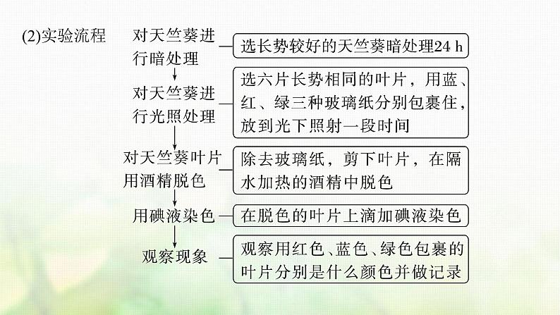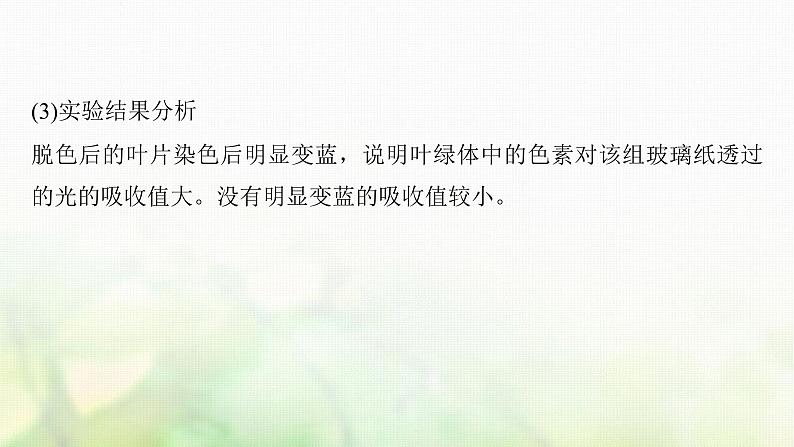 (3)实验结果分析脱色后的叶片染色后明显变蓝,说明叶绿体中的色素对该组玻璃纸透过的光的吸收值大。没有明显变蓝的吸收值较小。
