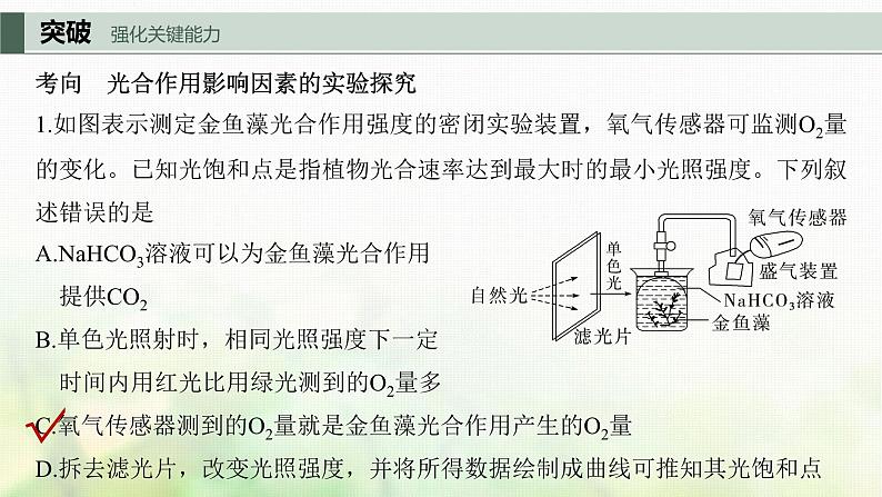 考向 光合作用影响因素的实验探究1.如图表示测定金鱼藻光合作用强度的密闭实验装置,氧气传感器可监测O2量的变化。已知光饱和点是指植物光合速率达到最大时的最小光照强度。下列叙述错误的是A.NaHCO3溶液可以为金鱼藻光合作用 提供CO2B.单色光照射时,相同光照强度下一定 时间内用红光比用绿光测到的O2量多C.氧气传感器测到的O2量就是金鱼藻光合作用产生的O2量D.拆去滤光片,改变光照强度,并将所得数据绘制成曲线可推知其光饱和点