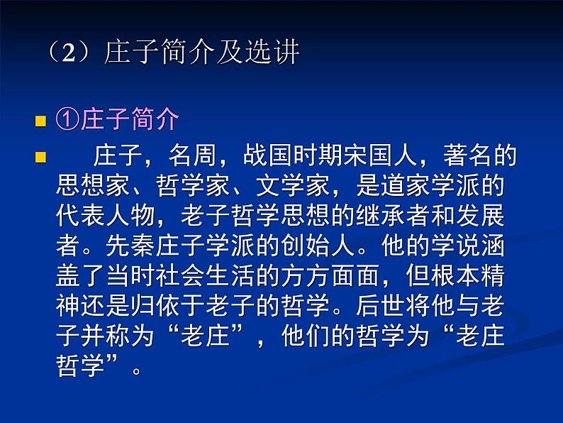 ①庄子简介 庄子,名周,战国时期宋国人,著名的思想家、哲学家、文学家,是道家学派的代表人物,老子哲学思想的继承者和发展者。先秦庄子学派的创始人。他的学说涵盖了当时社会生活的方方面面,但根本精神还是归依于老子的哲学。后世将他与老子并称为“老庄”,他们的哲学为“老庄哲学”。
