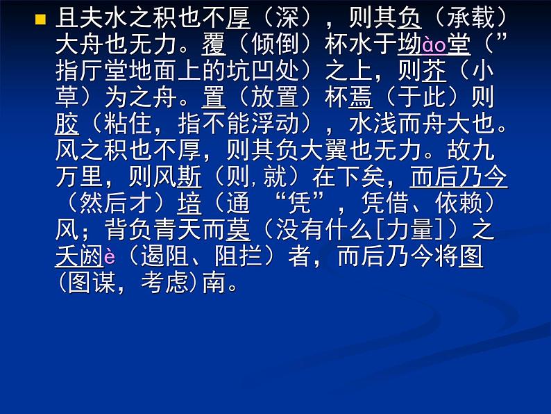 且夫水之积也不厚(深),则其负(承载)大舟也无力。覆(倾倒)杯水于坳à堂(”指厅堂地面上的坑凹处)之上,则芥(小草)为之舟。置(放置)杯焉(于此)则胶(粘住,指不能浮动),水浅而舟大也。风之积也不厚,则其负大翼也无力。故九万里,则风斯(则,就)在下矣,而后乃今(然后才)培(通 “凭”,凭借、依赖)风;背负青天而莫(没有什么[力量])之夭阏è(遏阻、阻拦)者,而后乃今将图(图谋,考虑)南。