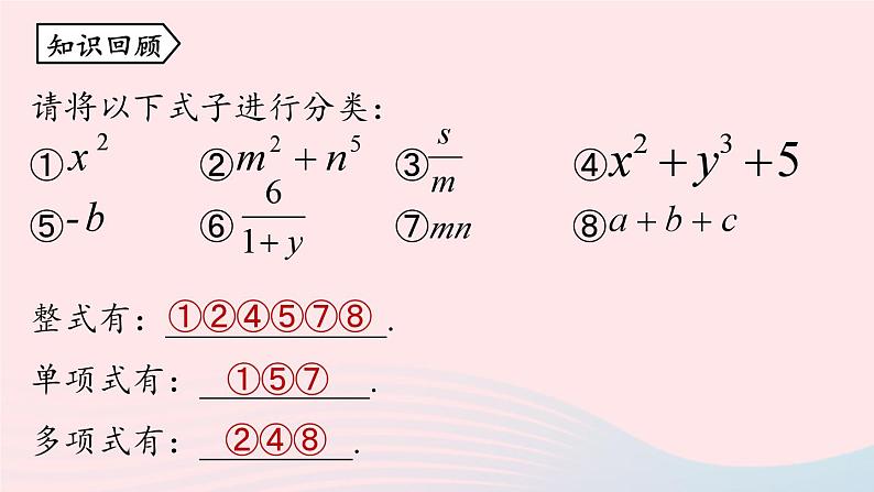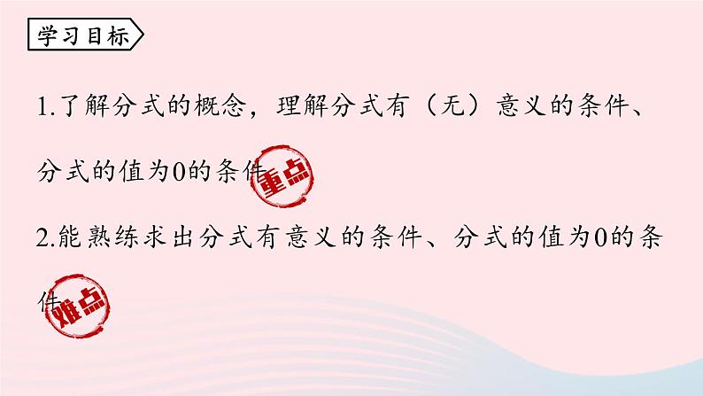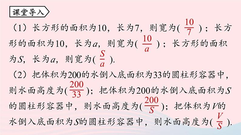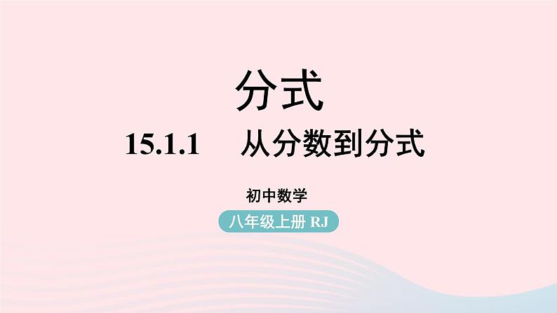 15.1.1 从分数到分式分式八年级上册 RJ初中数学请将以下式子进行分类:① ② ③ ④⑤ ⑥ ⑦mn ⑧ 整式有:_____________.单项式有:__________.多项式有:_________.①②④⑤⑦⑧①⑤⑦②④⑧知识回顾1.了解分式的概念,理解分式有(无)意义的条件、分式的值为0的条件.2.能熟练求出分式有意义的条件、分式的值为0的条件.学习目标(2)把体积为200的水倒入底面积为33的圆柱形容器中,则水面高度为( );把体积为200的水倒入底面积为S的圆柱形容器中,则水面高度为( );把体积为V的水倒入底面积为S的圆柱形容器中,则水面高度为( ).(1)长方形的面积为10,长为7,则宽为( ) ;长方形的面积为10,长为a,则宽为( ) ;长方形的面积为S,长为a,则宽为( ).课堂导入 式子 、 、 、 有什么共同点?它们与分数有什么相同点和不同点? 知识点1 分式的概念新知探究 辨析:分数与分式分式的概念可类比分数得到,分式的形式与分数类似,都有分子与分母,不同的是分数的分子与分母都是整数,而分式的分子与分母都是整式,且分式的分母中含有字母.跟踪训练新知探究例1 下列各式中,哪些是分式?哪些是整式?不能化简后再判断π是常数,不是字母知识点2 分式有意义的条件新知探究 跟踪训练新知探究 跟踪训练新知探究求分式有意义时字母的取值范围的方法(1)根据“分式有意义的条件”列不等式,求解可得分式有意义时字母的取值范围.(2)先令分母等于0构造方程,求出相应字母的值,然后在该字母的取值范围内去掉这些值(即令分母中的字母不等于这些值),便可得分式有意义时字母的取值范围.知识点3 分式的值为零的条件新知探究知识拓展新知探究1.列式表示下列各量:(1)某村有n个人,总耕地面积为40,则人均耕地面积为( ); (2)△ABC的面积为S,BC边的长为a,则高AD为( );随堂练习 1.列式表示下列各量:(3)一辆汽车b小时行驶了a km,则它的平均速度为( )km/h;一列火车行驶a km比这辆汽车少用1h,则它的平均速度为( )km/h. 2.下列式子中,哪些是分式?哪些是整式? 4.当x满足什么条件时,下列分式有意义?(1) ; (2) ; (3) ; (4) . 4.当x满足什么条件时,下列分式有意义?(1) ; (2) ; (3) ; (4) . 分式分式的概念课堂小结分式有意义的条件分式的值为0的条件分母不为0分子为0且分母不为0拓展提升Cx2≠0x≠0x2-1≠0x≠-1且x≠1x+1≠0x≠-12.当x为何值时,分式 的值为负数?解不等式组①得:-2