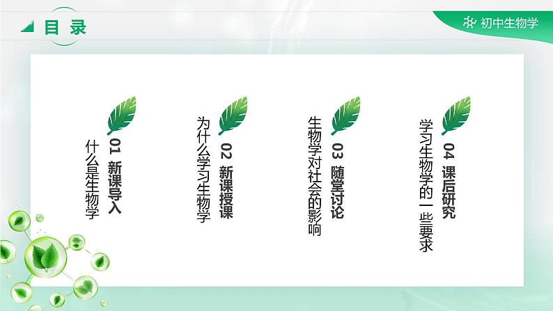 这是一份初中生物人教版 (新课标)七年级上册致同学们教课课件ppt,共27页。PPT课件主要包含了什么是生物学,为什么学习生物学,cntents,生物学对社会的影响,学习生物学的一些要求,PART01,PART02,PART03,PART04等内容,欢迎下载使用。