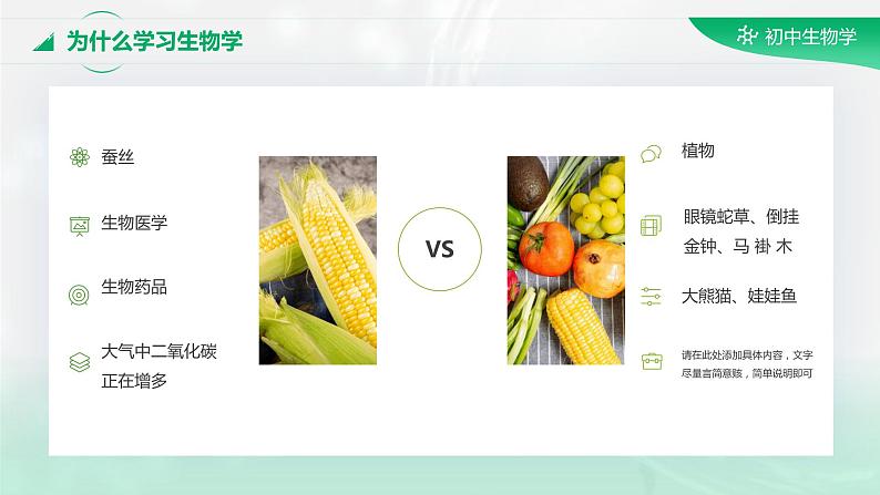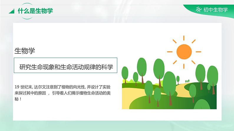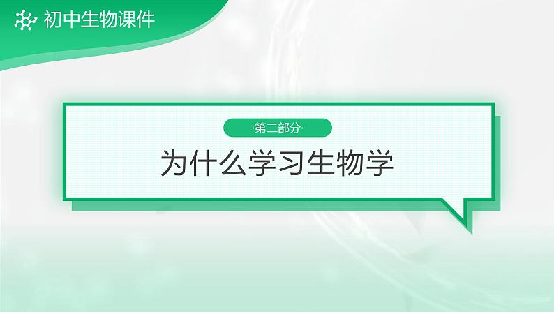 这是一份人教版 (新课标)七年级上册致同学们教课内容课件ppt,共21页。PPT课件主要包含了初中生物课件,什么是生物学,生物学,为什么学习生物学,生物学对社会的影响,袁隆平相关问题,试管婴儿,中国第一个试管婴儿,克隆技术,转基因技术等内容,欢迎下载使用。