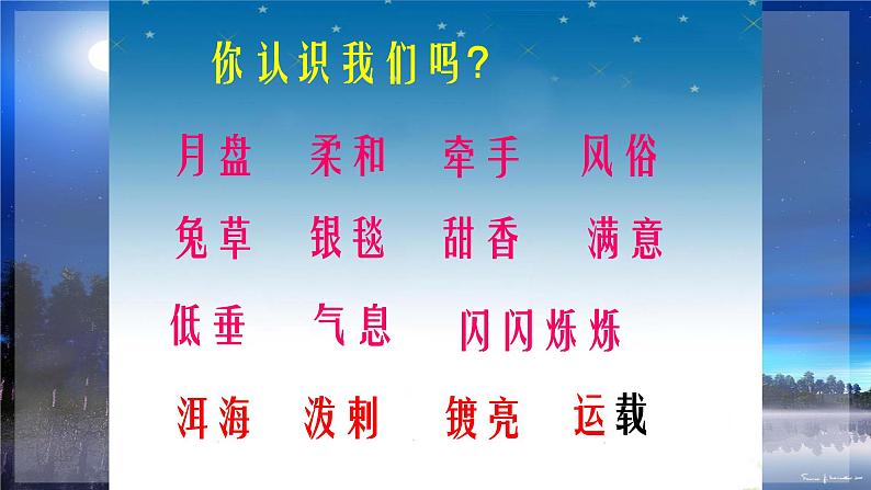 这是一份人教部编版四年级上册走月亮示范课课件ppt,共16页。PPT课件主要包含了走月亮,闪闪烁烁,你认识我们吗,啊我和阿妈走月亮,小路溪边田埂等内容,欢迎下载使用。