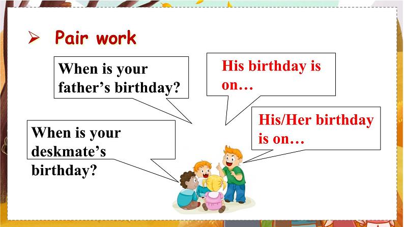 Step 1 Lead-in (PPT 4) | 1. Ask Ss to have a pair work to talk about the birthdays to practice the date and when-question. When is your father’s birthday? His birthday is on… 2. Lead in Grammar Focus. | 设计这个小组合作复习所学的内容,引入本节课的语法。该活动旨在为语法讲解做铺垫,引导学生学习相关语法知识。 | |||||