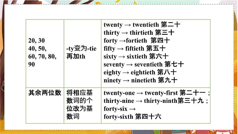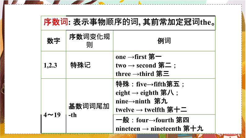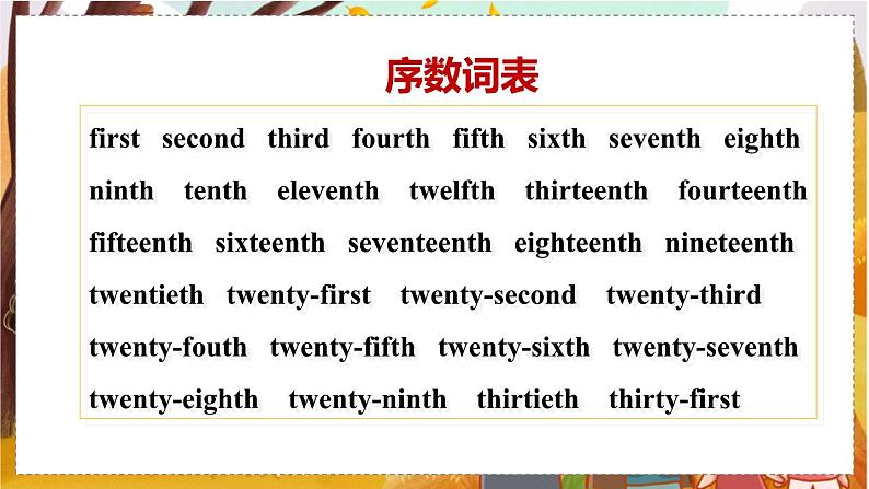 Step 2 Grammar Focus (PPT 5-10) | 1. Show the Grammar Focus and work on Grammar Focus. 2. Ask Ss to read the sentences in this part and pay attention to the ordinal numbers. 3. Explain rules of the ordinal number and practice them. 4. Ask Ss to complete the sentences in this part and pay attention to the ordinal numbers . 5. Practice the rules of the ordinal numbers. | 本部分主要展示Grammar Focus, 学习序数词的构成和用法等等。通过完成句子练习日期的表达和when句型等。 | |||||