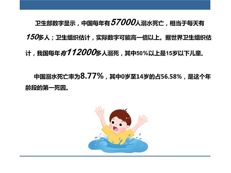 卫生部数字显示,中国每年有57000人溺水死亡,相当于每天有150多人;卫生组织估计,实际数字可能高一倍以上。据世界卫生组织估计,我国每年有112000多人溺死,其中50%以上是15岁以下儿童。 中国溺水死亡率为8.77%,其中0岁至14岁的占56.58%,是这个年龄段的第一死因。