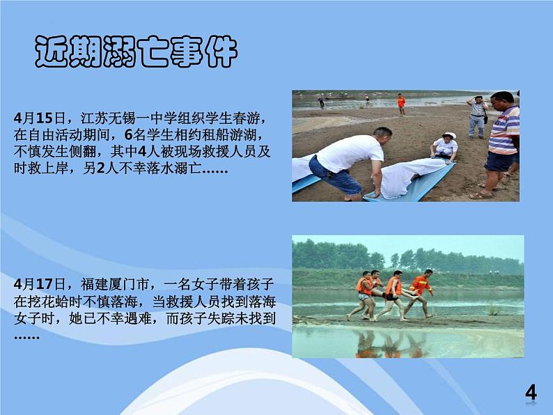 4月15日,江苏无锡一中学组织学生春游,在自由活动期间,6名学生相约租船游湖,不慎发生侧翻,其中4人被现场救援人员及时救上岸,另2人不幸落水溺亡……4月17日,福建厦门市,一名女子带着孩子在挖花蛤时不慎落海,当救援人员找到落海女子时,她已不幸遇难,而孩子失踪未找到……