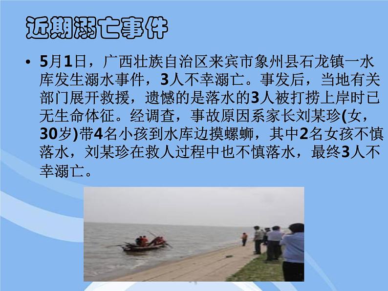 5月1日,广西壮族自治区来宾市象州县石龙镇一水库发生溺水事件,3人不幸溺亡。事发后,当地有关部门展开救援,遗憾的是落水的3人被打捞上岸时已无生命体征。经调查,事故原因系家长刘某珍(女,30岁)带4名小孩到水库边摸螺蛳,其中2名女孩不慎落水,刘某珍在救人过程中也不慎落水,最终3人不幸溺亡。