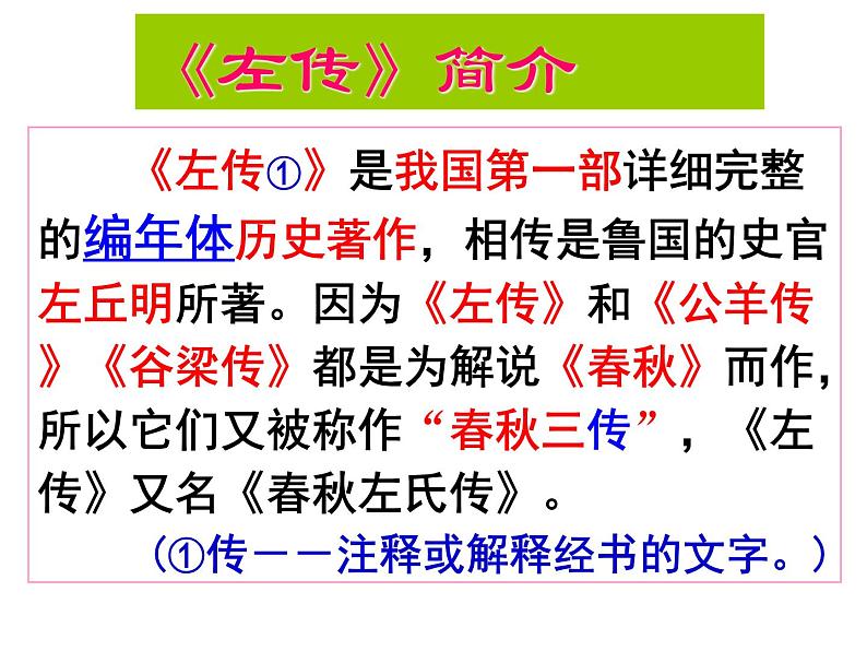 《左传①》是我国第一部详细完整的编年体历史著作,相传是鲁国的史官左丘明所著。因为《左传》和《公羊传》《谷梁传》都是为解说《春秋》而作,所以它们又被称作“春秋三传”,《左传》又名《春秋左氏传》。 (①传--注释或解释经书的文字。)