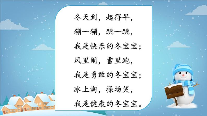 冬天到,起得早,蹦一蹦,跳一跳,我是快乐的冬宝宝;风里闹,雪里跑,我是勇敢的冬宝宝;冰上淘,操场笑,我是健康的冬宝宝。