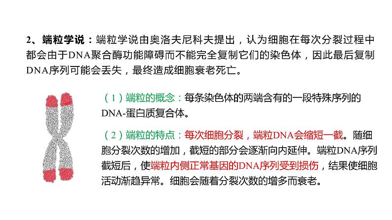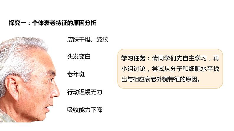 第3节 细胞的衰老和死亡第6章 细胞的生命历程 人到了一定年龄就会出现白头发,并且随着年龄的增长,白头发往往会越来越多。白头发生成的直接原因是毛囊细胞合成黑色素的功能下降。老年人毛囊细胞衰老,细胞中的酪氨酸酶活性降低,黑色素合成减少,头发就会发白。问题探讨1.老年人白头发的形成与毛囊细胞的衰老有怎样的关系?老年人体内还会有幼嫩的细胞,如精原细胞仍能增殖产生精子,造血干细胞一生都能增殖和产生各种类型的血细胞;年轻人体内也有衰老的细胞,如皮肤表皮细胞衰老成角质层细胞,最后细胞凋亡、脱落。人体衰老与细胞衰老并不是一回事。人体内的细胞总是在不断更新着,总有一部分细胞处于衰老或走向死亡的状态。但从总体上看,人体衰老过程也是组成人体细胞普遍衰老的过程。问题探讨2.老年人体内有没有幼嫩的细胞?年轻人体内有没有衰老的细胞?3.细胞衰老与个体衰老有什么关系?出生、生长、衰老和死亡,是生物界的正常现象,生物个体如此,细胞也是如此。 生物体内的绝大多数细胞,都经过分裂、分化、衰老、死亡这几个阶段。细胞衰老的概念:细胞衰老的过程是细胞的生理状态和化学反应发生复杂变化的过程,最终表现为细胞的形态、结构和功能发生变化。一、细胞衰老的特征皮肤干燥、皱纹头发变白老年斑吸收能力下降行动迟缓无力探究一:个体衰老特征的原因分析学习任务:请同学们先自主学习,再小组讨论,尝试从分子和细胞水平找出与相应衰老外貌特征的原因。一、细胞衰老的特征细胞内水分减少,体积变小细胞内酶(酪氨酸酶)活性降低细胞内色素(脂褐素)的积累细胞膜通透性功能改变细胞内呼吸速率减慢细胞衰老的主要特征细胞核的体积增大探究一:个体衰老特征的原因分析皮肤干燥、皱纹头发变白老年斑吸收能力下降行动迟缓无力一、细胞衰老的特征1、自由基学说:德纳姆•哈曼在1956年提出,认为衰老过程中的退行性变化是由于细胞正常代谢过程中产生自由基的有害作用造成的。(1)自由基:异常活泼的带电分子或基团(3)自由基的产生:细胞内的氧化反应产生,辐射和有害物质的入侵刺激细胞产生。(2)自由基的特性:含有未配对的电子,有高度的反应活泼性(4)自由基的作用:自由基会攻击和破坏细胞内各种执行正常功能的生物分子。攻击生物膜的组成成分磷脂分子时,对生物膜损伤;会引起雪崩式反应。攻击DNA,可以引起基因突变;攻击蛋白质,使蛋白质活性下降,导致细胞衰老。二、细胞衰老的原因2、端粒学说:端粒学说由奥洛夫尼科夫提出,认为细胞在每次分裂过程中都会由于DNA聚合酶功能障碍而不能完全复制它们的染色体,因此最后复制DNA序列可能会丢失,最终造成细胞衰老死亡。(1)端粒的概念:每条染色体的两端含有的一段特殊序列的DNA-蛋白质复合体。(2)端粒的特点:每次细胞分裂,端粒DNA会缩短一截。随细胞分裂次数的增加,截短的部分会逐渐向内延伸。端粒DNA序列截短后,使端粒内侧正常基因的DNA序列受到损伤,结果使细胞活动渐趋异常。细胞会随着分裂次数的增多而衰老。二、细胞衰老的原因合理的饮食结构 健康的生活习惯 适宜的体育锻炼 乐观的生活态度 体内细胞的超氧化物歧化酶(SOD)可清除部分自由基,食物中维生素C、维生素E等也可起到清除自由基的作用。如何延缓人体衰老二、细胞衰老的原因 年龄因素与细胞衰老的关系实验1:在相同的条件下,分别单独培养胎儿、中年人和老年人的肺成纤维细胞,结果如下表:年龄越大的个体的细胞可增殖的代数越少,反之越多。说明细胞会随着分裂次数的增多而衰老。实验结论:思考•讨论二、细胞衰老的原因实验2: 将年轻人的体细胞去核后与老年人的细胞核融合;将老年人的体细胞去核后与年轻人的细胞核融合。分别在体外培养。结果是前者不分裂,后者分裂旺盛。细胞核对细胞分裂的影响大。细胞核是细胞生命活动的控制中心,随着细胞分裂次数的增多,或者细胞进入衰老状态,细胞核中的遗传物质会出现收缩状态,细胞中一些酶的活性会下降,从而影响细胞的生活。说明细胞会随着年龄的增大而衰老。实验结论: 年龄因素与细胞衰老的关系思考•讨论二、细胞衰老的原因①有利方面:细胞衰老是人体内发生的正常生命现象,正常的细胞衰老有利于机体更好地实现自我更新。例如,人体皮肤生发层细胞不断分裂产生新的细胞以替代衰老的细胞;血液中红细胞的快速更新可保障机体所需氧气的供应。②不利方面:众多细胞的衰老会导致人体的衰老,会出现免疫力下降、适应环境能力减弱等现象。三、细胞衰老的意义细胞死亡包括凋亡和坏死等方式,其中凋亡是细胞死亡的一种主要方式。四、细胞的死亡①定义:由基因所决定的细胞自动结束生命的过程。细胞凋亡受到严格的由遗传机制决定的程序性调控,是一种程序性死亡。②实质:与凋亡相关的基因选择性表达的结果1、细胞凋亡③细胞凋亡意义: 抵御外界因素的干扰:某些被病原体感染的细胞的清除完成正常生长发育:人体胚胎时期,尾的消失;蝌蚪发育过程,尾的消失;胎儿手发育过程中,手指连接处细胞的自动死亡。维持内部环境的稳定:清除受损、突变、衰老的细胞四、细胞的死亡 2、细胞坏死:(2)实例:① 烫伤的皮肤细胞的死亡;② 骨折后骨细胞的死亡;③ 吸烟者肺部细胞因尼古丁作用的死亡。(