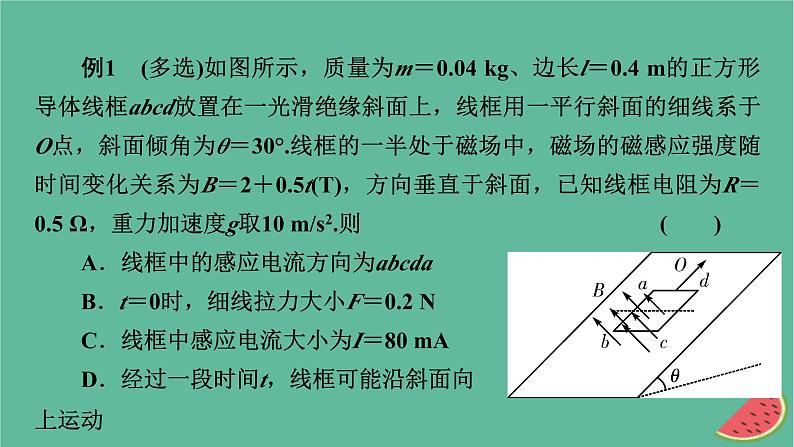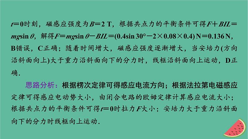 第二章 电磁感应微课题3 电磁感应中的动力学问题一、导体棒在磁场中静止两种状态及处理方法:例1 (多选)如图所示,质量为m=0.04 kg、边长l=0.4 m的正方形导体线框abcd放置在一光滑绝缘斜面上,线框用一平行斜面的细线系于O点,斜面倾角为θ=30°.线框的一半处于磁场中,磁场的磁感应强度随时间变化关系为B=2+0.5t(T),方向垂直于斜面,已知线框电阻为R=0.5 Ω,重力加速度g取10 m/s2.则 ( )A.线框中的感应电流方向为abcdaB.t=0时,细线拉力大小F=0.2 NC.线框中感应电流大小为I=80 mAD.经过一段时间t,线框可能沿斜面向上运动【答案】CD t=0时刻,磁感应强度为B=2 T,根据共点力的平衡条件可得F+BIL=mgsin θ,解得F=mgsin θ-BIL=(0.4sin 30°-2×0.08×0.4) N=0.136 N,B错误,C正确;随着时间增大,磁感应强度逐渐增大,当安培力(方向沿斜面向上)大于重力沿斜面向下的分力时,线框沿斜面向上运动,D正确.思路分析:根据楞次定律可得感应电流方向;根据法拉第电磁感应定律可得感应电动势大小,由闭合电路的欧姆定律计算感应电流大小;根据共点力的平衡条件可得t=0时拉力F大小;安培力大于重力沿斜面向下的分力时线框向上运动.二、导体棒在磁场中做匀速运动力学对象和电学对象的相互关系:例2 如图,水平面(纸面)内间距为l的平行金属导轨间接一电阻,质量为m、长度为l的金属杆置于导轨上.t=0时,金属杆在水平向右、大小为F的恒定拉力作用下由静止开始运动.t0时刻,金属杆进入磁感应强度大小为B、方向垂直于纸面向里的匀强磁场区域,且在磁场中恰好能保持匀速运动.杆与导轨的电阻均忽略不计,两者始终保持垂直且接触良好,两者之间的动摩擦因数为μ.重力加速度大小为g.求:(1)金属杆在磁场中运动时产生的电动势的大小; (2)电阻R的阻值.思路分析:分别画出金属杆进入磁场前、后的受力示意图如图甲、乙所示,有助于快速准确的求解问题.解:(1)设金属杆进入磁场前的加速度大小为a,由牛顿第二定律得ma=F-μmg, ①设金属杆到达磁场左边界时的速度为v,由运动学公式有v=at0, ②当金属杆以速度v在磁场中运动时,由法拉第电磁感应定律可得,杆中的电动势为E=Blv, ③联立①②③式可得式中R为电阻的阻值.金属杆所受的安培力为F安=BlI, ⑥因金属杆做匀速运动,由牛顿运动定律得F-μmg-F安=0, ⑦三、导体棒在磁场中做加速运动动态分析的基本思路:例3 如图甲,间距为L的光滑导轨水平放置在竖直向下的匀强磁场中,磁感应强度为B,轨道左侧连接一定值电阻R,垂直导轨的导体棒ab在水平外力F作用下沿导轨运动,F随t变化的规律如图乙.在0~t0时间内,棒从静止开始做匀加速直线运动.乙图中t0、F1、F2为已知,棒接入电路的电阻为R,轨道的电阻不计.则下列说法正确的是 ( )【答案】D 四、导体框运动的分析 电磁感应中导体框运动与电路知识的关系图:例4 如图所示,水平地面上方矩形区域内存在垂直纸面向里的匀强磁场,两个闭合线圈Ⅰ、Ⅱ分别用同种导线绕制而成,其中Ⅰ为边长为L的正方形线圈,Ⅱ是长2L、宽为L的矩形线圈,将两个线圈同时从图示位置由静止释放,线圈下边进入磁场时,Ⅰ立即做了一段时间的匀速运动.已知两线圈在整个下落过程中,下边始终平行于磁场上边界,不计空气阻力,则 ( )A.下边进入磁场时,Ⅱ也立即做匀速运动B.从下边进入磁场开始的一段时间内,线圈Ⅱ做加速度不断减小的加速运动C.从下边进入磁场开始的一段时间内,线圈Ⅱ做加速度不断减小的减速运动D.线圈Ⅱ先到达地面【答案】C 1.(多选)如图所示,在以水平线段AD为直径的半圆形区域内有磁感应强度大小为B、方向垂直纸面向里的有界匀强磁场.现有一个闭合导线框ACD由细软弹性电阻丝制成,端点A、D固定.在竖直面内,将导线与圆周的接触点C点以恒定角速度ω(相对圆心O)从A点沿圆弧移动至D点,使导线框上产生感应电流.设导线框的电阻恒为r,圆的半径为R,从A点开始计时,下列说法正确的是 ( )A.导线框中感应电流的方向先逆时针,后顺时针B.在C从A点移动到D点的过程中,穿过ACD回路的磁通量与时间的关系为Φ=BR2sin ωtD.若以AD为轴,保持∠ADC=45°,将导线框以恒定的角速度ω2向纸面外转过90°的过程中,回路中的电动势逐渐减小【答案】ABC 若以AD为轴,保持∠ADC=45°, AC及CD边的速度方向与磁场方向的夹角从零逐渐变大,依题意,其回路中的电动势与时间t的关系式为e=BR2ω2sin ω2t,将导线框以恒定的角速度ω2向纸面外转出90°的过程中,其电动势逐渐变大,故D错误.【答案】AB 3.如图甲,与水平面成一定倾角、间距为l=0.1 m的足够长的平行金属导轨底端接有阻值为R=0.1 Ω的电阻,金属棒ab垂直于导轨放置.以导轨底端为原点、沿导轨向上为x轴正方向,在0.3 m≤x≤1.0 m区间内有垂直于导轨平面向上的匀强磁场,磁感应强度大小为B=2.0 T.从t=0时刻起,金属棒ab在沿x轴正方向的外力F作用下,从x=0处由静止开始沿导轨向上运动,其速度v与位移x的关系图像如图乙所示(x≤1.0 m).金属棒ab在运动过程中始终保持与导轨垂直,且与导轨接触良好,不计金属棒ab与导轨的电阻.求:(1)当金属棒ab运动至x=0.4 m处时,通过电阻R的电流的大小;(2)在0.3 m≤x≤1.0 m区间内,作用在金属棒ab上的安培力FA与位移x的关系式;(3)金属棒ab在整个磁场的运动过程中电阻R所产生的焦耳热.解:(1)根据题意,由题图乙可知,金属棒的速度v与位移x的关系为v=5x(x≤1.0 m),则当x=0.4 m时,金属棒的速度为v1=2 m/s,此时,感应电动势为E=Blv=0.4 V