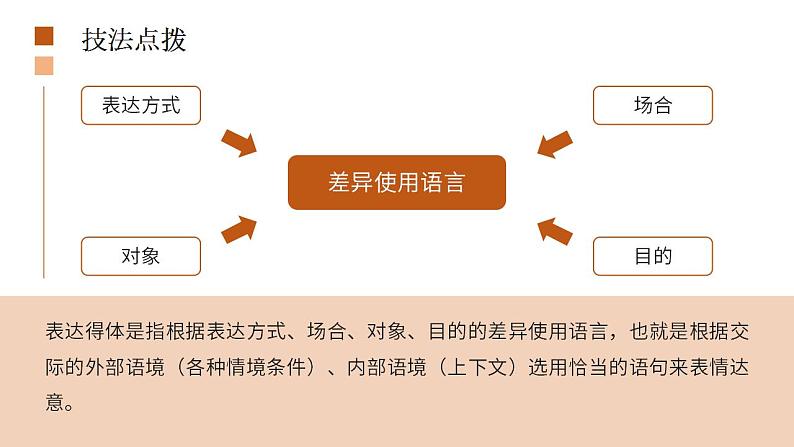 表达得体是指根据表达方式、场合、对象、目的的差异使用语言,也就是根据交际的外部语境(各种情境条件)、内部语境(上下文)选用恰当的语句来表情达意。