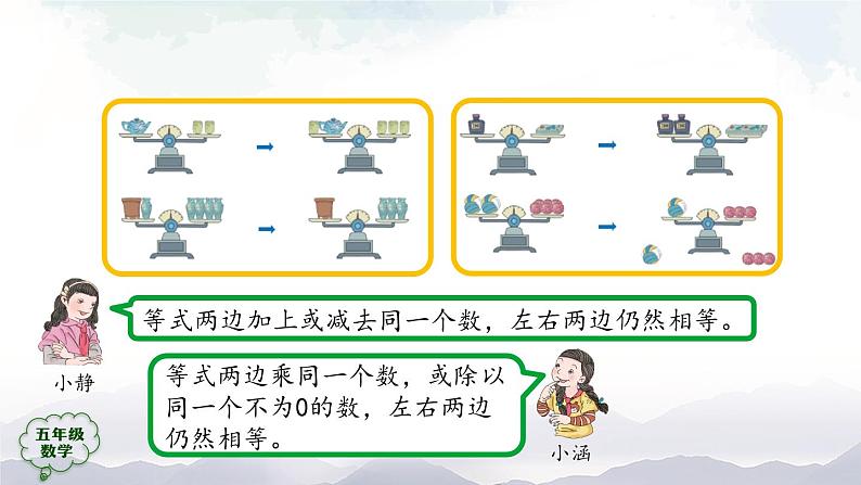 这是一份人教版五年级上册5 简易方程2 解简易方程解方程教学课件ppt,共30页。PPT课件主要包含了看图列方程,用等式的性质解方程,回顾小结,①2x÷3=18,回顾反思分享收获,多次运用等式的性质,数学书第69页等内容,欢迎下载使用。